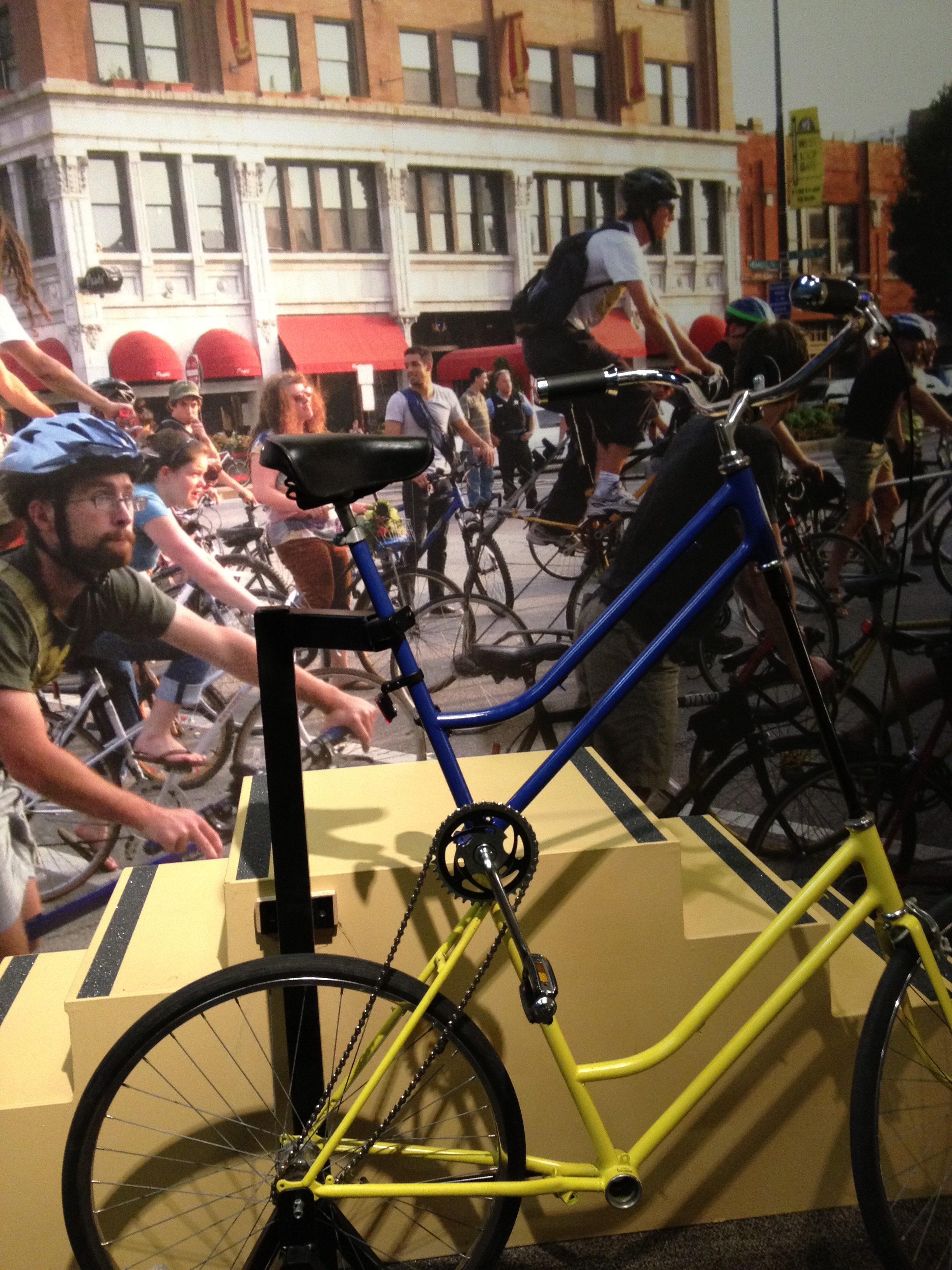 A room designed to feel like a bicycle repair shop, featuring bicycle repair videos, a space for live demonstrations, and and bike building station for young children.A tall bike, custom built for the exhibit.Historic bicycles displayed on a velodrome-like curved platform